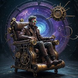 A **time traveler** in a **steampunk-inspired mechanical armchair**, hurtling through a **swirling void of time and space**, where fragmented objects from different eras—ancient scrolls, medieval swords, Victorian pocket watches, futuristic holograms, and retro sci-fi gadgets—float chaotically around them. The traveler, clad in a **weathered leather coat with brass buckles and goggles**, grips the armrests tightly, their expression a mix of **determination and awe** as temporal distortions ripple through the void. The mechanical chair is **intricate and industrial**, with exposed gears, glowing energy cores, and rusted metal plating, suggesting both **advanced technology and the passage of time**. The scene is rendered in a **highly detailed, cinematic style**, blending **dark, moody lighting** with **vibrant bursts of temporal energy**—swirling blues, purples, and golds—illuminating the floating artifacts. The background is a **cosmic abyss** with faint constellations and warped timelines visible in the distance, creating a sense of **both vastness and urgency**. The composition emphasizes **motion and dynamism**, with debris trailing behind the chair as if caught in a **time warp**, while the traveler’s posture suggests **forward momentum into the unknown**. Inspired by **sci-fi concept art and dark fantasy illustrations**, the image balances **mechanical precision** with **ethereal surrealism**, evoking a feeling of **adventure, mystery, and the relentless march of time**.