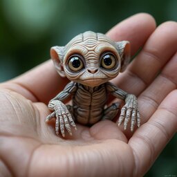 A hyper-detailed, ultra-realistic close-up of a **tiny, adorable humanoid creature** resting delicately on the palm of a hand, showcasing intricate textures and lifelike proportions. The creature is no larger than a thumb, with soft, glowing skin that subtly shimmers under gentle light, and expressive, wide-eyed features radiating innocence and wonder. Its tiny fingers and toes are perfectly formed, with delicate wrinkles and minuscule nails, adding to its charm. The hand holding it is warm and slightly tanned, with visible pores, fine lines, and soft shadows that emphasize the contrast in scale—highlighting the fragility and cuteness of the little being. The background is softly blurred, drawing full focus to the **micro-world** on the palm, with a hint of a dreamy, ethereal glow surrounding the scene. The lighting is soft yet dramatic, casting gentle shadows that accentuate the **three-dimensional depth** of the creature’s form, making it appear almost tangible. The overall mood is whimsical and magical, evoking a sense of **awe and tenderness**, as if this tiny humanoid is a secret from another realm, momentarily trusted to the viewer’s care. **Style:** Hyper-realistic, cinematic detail, ultra-high definition, with a touch of fantasy warmth—every pore, wrinkle, and strand of imaginary hair (if present) is meticulously rendered to create an immersive, believable miniature world.