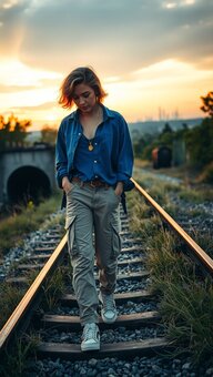 **Film 8K wideshot from a low angle:** A young woman, dressed in a royal blue oversized shirt with an open collar, beige cargo pants, and low-top sneakers, walks along an abandoned railway track during the golden hour. A golden necklace glints around her neck, and her tousled hair gently sways with each step. Her hands are tucked into her pockets, and her head is slightly bowed, suggesting deep thought or introspection. The foreground is sharply focused, capturing the textures of her clothing and the overgrown tracks, while the background blurs into a soft bokeh, obscuring an abandoned tunnel, an old train car, and distant trees. The sky above is dramatic, painted with hues of the setting sun, and a faint outline of a distant city skyline is visible. The natural color grading is rich and vibrant, with soft golden light bathing the scene, enhancing the mood of solitude and journey. The image evokes a sense of adventure and self-reflection, as the young woman appears to be on a personal journey or escape.