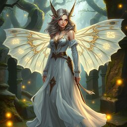 Draw a striking fantasy illustration featuring a moth-inspired humanoid character. She stands confidently, displaying intricate hair with soft curls that flow elegantly over her shoulders. Her wings, reminiscent of a moth’s wings, are detailed with delicate patterns. The character wears a translucent outfit adorned with butterfly motifs, enhancing her ethereal appearance. Her facial features exhibit a fierce yet captivating expression, with sharp cheekbones and intense eyes, conveying a sense of mystery. The lighting is soft, casting gentle shadows that highlight her form and the intricate details of her clothing and wings. The composition is dynamic, with a focus on her pose that suggests movement and grace. The overall style blends realism with fantasy elements, creating a visually captivating portrait.