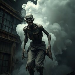 A terrifying zombie emerging from a dense white smoke billowing out of a factory, its tattered clothes barely hanging on its decaying body. The zombie’s skin is pale and rotting, with visible wounds and a menacing expression. The factory in the background is old and abandoned, with broken windows and rusted metal structures. The smoke is thick and swirling, adding a sense of mystery and dread. The scene is dark and eerie, with a focus on the zombie’s slow, lumbering movements as it steps forward. The drawing style is realistic and detailed, with a emphasis on the textures of the zombie’s skin and the smoke, creating a chilling and atmospheric image.
