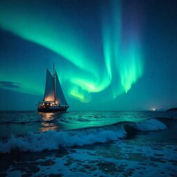 Aurora borealis illuminates the night sky with vibrant waves of green, blue, and purple hues, dancing above the dark sea, where multiple waves gently crash against the shore, a majestic ship sails in the distance, its white sails and brown hull a striking contrast to the colorful display of the northern lights, with the ship’s crew visible on deck, their faces filled with a mix of awe and curiosity, the overall scene is one of breathtaking beauty, with the vibrant colors of the aurora reflected in the waves below, creating a sense of movement and energy, the ship’s mast and sails are silhouetted against the bright colors of the aurora, adding depth and dimension to the image.