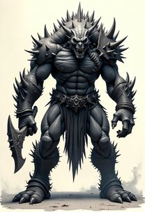 Draw a highly detailed black-and-white dark fantasy illustration of a monstrous humanoid creature composed of jagged, armor-like plates and sharp, menacing protrusions. The creature wields a massive, wood-textured axe with jagged edges in one hand, exuding raw power and ferocity. Emphasize a dynamic, aggressive pose with a fierce, intimidating expression, showcasing muscular limbs layered with scale-like textures. Use intricate linework, deep shading, and high contrast to highlight the clash between sharp, jagged elements and smoother surfaces. The style should blend dark fantasy and comic book aesthetics, focusing on dramatic depth, menacing atmosphere, and a sense of overwhelming strength.