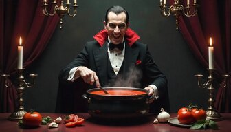 A darkly humorous digital painting of a vampire hosting a vintage-style cooking show, standing behind a gothic kitchen counter draped in velvet. The vampire wears an elegant black tuxedo with a crimson-lined cape, his pale skin contrasting with his mischievous grin and gleaming fangs. In front of him, a large steaming cauldron of rich tomato soup glows with a deep red hue, illuminated by flickering candelabras and ornate chandeliers above. On the counter are neatly arranged ingredients—ripe tomatoes, garlic cloves (carefully avoided), and antique silver ladles. The vampire theatrically stirs the pot as though presenting to an invisible audience, his long, elegant fingers making dramatic gestures. The scene combines gothic horror with playful parody, blending cinematic lighting, rich textures, and a surreal comedic atmosphere, as if Count Dracula himself became the charming host of a macabre cooking show.