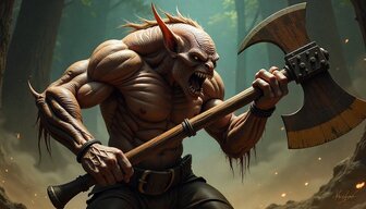 Monstrous humanoid creature, muscular limbs layered with scale-like textures, wielding massive wood-textured axe, dynamic aggressive pose, fierce expression, intricate linework, deep shading, high contrast, blending dark fantasy and comic book aesthetics, reminiscent of Simon Bisley, Frank Frazetta, and Joe Madureira’s styles.