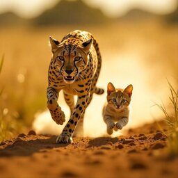 A **hyper-realistic masterpiece** featuring a **powerful, muscular cheetah** and an **adorable small house cat** sprinting side by side across the **golden savannah**, their movements perfectly synchronized in a **dynamic, high-speed chase**. The cheetah’s **lean, athletic body** is captured mid-stride, muscles taut with explosive energy, its fur sleek and wind-tossed, while the tiny house cat—**fluffy, round-faced, and full of determination**—keeps pace with comically tiny but swift paws, ears flattened by the rush of air. The **savannah vegetation** blurs in the background, with **tall grasses bending under their speed** and **dust kicking up in a golden haze**, emphasizing the **motion blur and sense of velocity**. The scene is bathed in **warm, cinematic lighting**, with **lens flares** streaking through the air and a **soft bokeh effect** in the distance, creating a **dramatic yet whimsical** contrast between the **majestic predator and the fearless little companion**. Every detail—from the **textured fur and glinting eyes** to the **rippling muscles and scattered sand**—is rendered with **unparalleled realism, precision, and artistic mastery**, making this a **breathtaking, high-quality composition** that feels alive with movement and emotion.