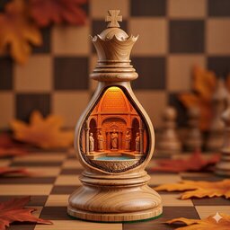 **** Image features a detailed and artistic wooden sculpture chess piece styled as the age of the chivalry queen, intricately carved with a hollow center. Inside the hollow center, is a miniature scene depicting traditional Medieval period architecture, including the inside of a temple with a pool and statues, illuminated with a warm, orange glow that suggests an internal light source. The sculpture is placed on a smooth, round wooden base. The craftsmanship highlights the natural wood grain. The background is softly blurred wooden chess board, with scattered autumn leaves in shades of orange and brown, adding a seasonal touch. The lighting is soft, emphasizing the details and textures of the sculpture and surrounding elements.