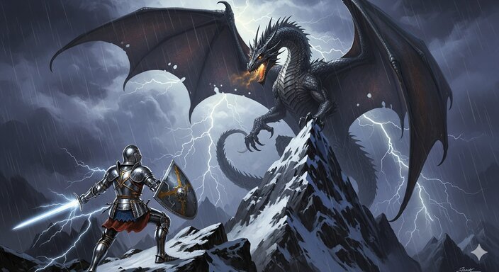 A dramatic depiction of a knight confronting a colossal, ancient dragon atop a jagged mountain peak during a fierce thunderstorm. The knight’s armor gleams in the lightning flashes, and the dragon’s scales shimmer with dark energy. Masterpiece Monday inspiration, presented as a digital painting in the epic fantasy art style of Frank Frazetta, with bold brushstrokes and a powerful, dynamic composition.