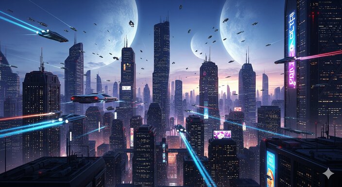 A breathtaking cityscape at twilight, with towering, futuristic skyscrapers reaching into a sky filled with twin moons. Flying vehicles zip between buildings, leaving trails of light. This is a masterpiece Monday scene, rendered in a highly detailed, photorealistic digital painting style, evoking a sense of wonder and advanced civilization.