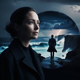 A cinematic double exposure portrait of a women staring calmly into the distance. Inside his silhouette, a dramatic cliffside vista is revealed—waves crashing below, wind pulling at the coat of a lone figure standing at the edge (himself), overlooking a stormy sea. Lightning flickers behind clouds in the far horizon. The outer portrait is dark and windswept, with sharp contrast and misty tones. Symbolic of emotional reckoning, decision, and the edge of transformation.