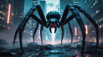 A hyper-realistic cinematic photograph of a colossal spider looming over a sprawling, modern cityscape at dusk. The spider, with intricate, textured exoskeleton details—glistening hairs, segmented legs, and reflective eyes—dominates the scene, its massive legs striding between towering skyscrapers, casting long, eerie shadows across the streets below. The city is alive with neon signs, flickering streetlights, and the faint glow of office windows, creating a stark contrast between the organic horror of the spider and the cold, geometric precision of urban architecture. The atmosphere is thick with tension, as if the city’s inhabitants have fled in terror, leaving behind abandoned cars, scattered debris, and flickering emergency lights. The lighting is dramatic, with deep shadows and highlights emphasizing the spider’s menacing presence, while a faint mist swirls around its legs, adding to the sense of scale and unease. The composition is cinematic, with a wide-angle perspective that captures both the overwhelming size of the spider and the intricate details of the city, evoking a feeling of awe and dread. Ultra HD, 8K resolution, hyper-detailed textures, volumetric lighting, and a moody, high-contrast color palette.