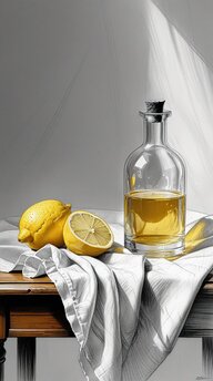 A meticulously detailed black-and-white pencil sketch showcasing a **classical still life composition**—a vintage wooden table draped with a delicate linen cloth, holding a half-peeled lemon beside a crystal-clear glass bottle filled with golden liquid, its cork slightly ajar. The scene is bathed in soft, directional light casting gentle shadows that accentuate the **textured surfaces**: the lemon’s dimpled rind, the bottle’s reflective curves, and the cloth’s subtle folds. The **linework is elegant yet precise**, with **varied stroke weights**—bold outlines defining the objects’ contours, while finer, feathered strokes render the **gradual shading transitions**, creating a **three-dimensional depth**. The background fades into a **soft, neutral gradient**, ensuring the focus remains on the **realistic textures**—the lemon’s zest glistening faintly, the bottle’s condensation, and the cloth’s woven threads. The composition is **balanced and minimalistic**, evoking a **timeless, artistic atmosphere**—ideal for traditional art enthusiasts who appreciate **realism with a hand-drawn, sketch-like charm**. Style: ** Pencil Master – Black-and-white realistic pencil sketch, classical artistry with intricate detailing.**