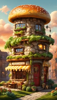Imagine a colossal hamburger house nestled in a whimsical landscape, where the walls are made of juicy beef patties, the roof is a sesame seed bun, and the windows are glowing pickles. A winding path of golden french fries leads to the ketchup-smeared slider door, with tiny condiment bottles as garden decorations. The sky above is a swirl of soft sunset hues, casting a warm, appetizing glow over the scene. Capture this culinary fantasy with hyper-detailed realism and playful surrealism, reminiscent of SketchArk v8, focusing on rich textures and a dreamy, storybook charm. The lighting is soft yet vibrant, enhancing the colors of the ingredients while maintaining a cozy and inviting mood.