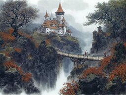 a narrow footbridge over a deep gorge leads to an elven castle with round towers detailed matte painting, deep color, fantastical, intricate detail, splash screen, complementary colors, fantasy concept art, 8k resolution trending on Artstation Unreal Engine 5